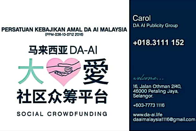 您的拜访和捐助,是这群残障人士的一个希望 ❤https://www.facebook.com/shuangxin100.org/ 💞双心儿童残障福利中心 FB Link: https://m.facebook.com/shuangxin100.org/ Contact:0132888533 Max —————————————————— 伙食费用 🍚(21位) :RM3500 医药费用 💊:RM2500 总共一个月:RM6000 —————————————— 希望可以有善心人士的帮助,让孩子们有三餐温饱以及看医生的费用。 有意者请将款项汇入官方户口: 🌺银行户口: 【Persatuan…
